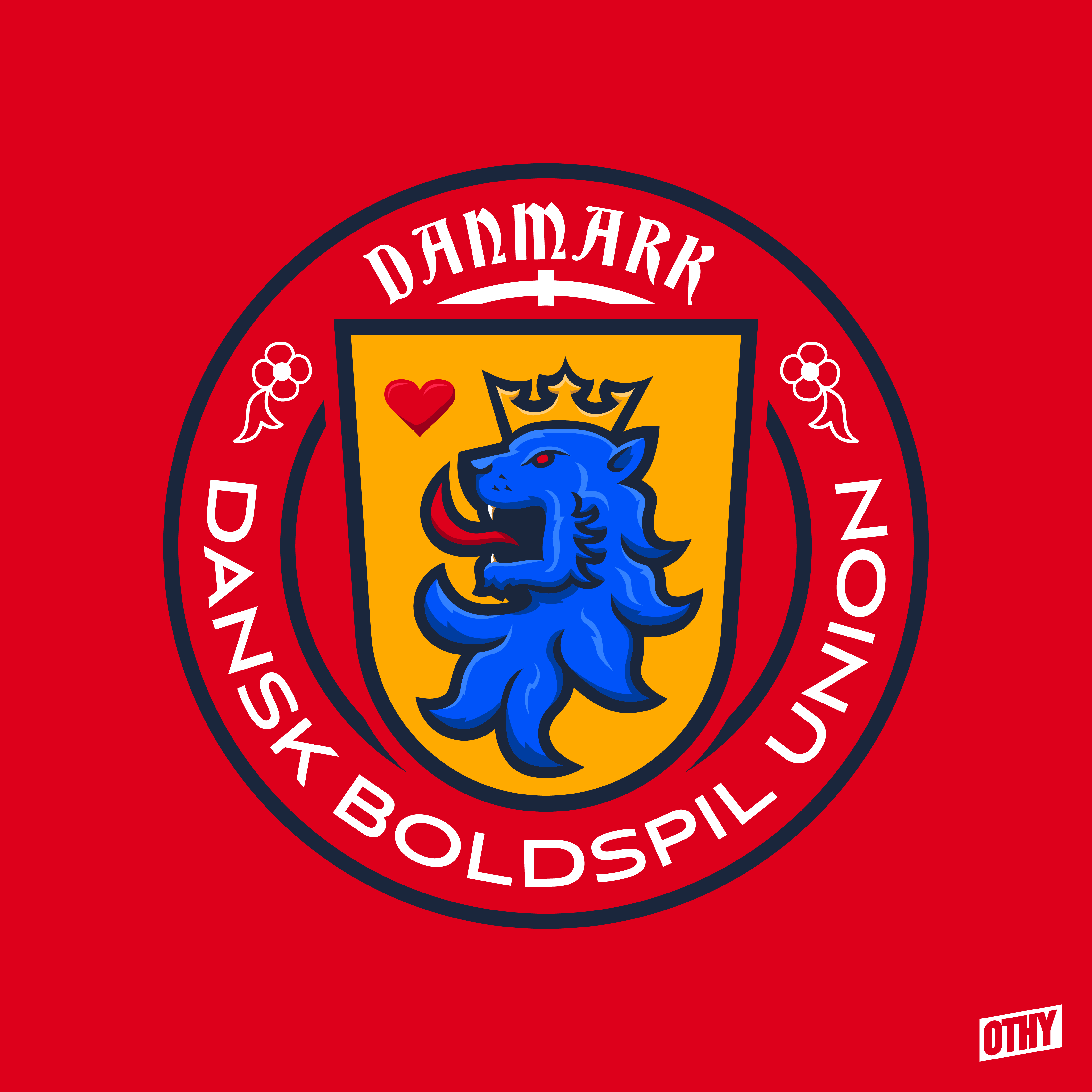 This Denmark crest is based on the Danish coat of arms, with the gold shield, blue lion, and red heart. I've taken elements from the current crest - mainly the round shape and the flowers - and added a cross above the shield to represent the national flag.