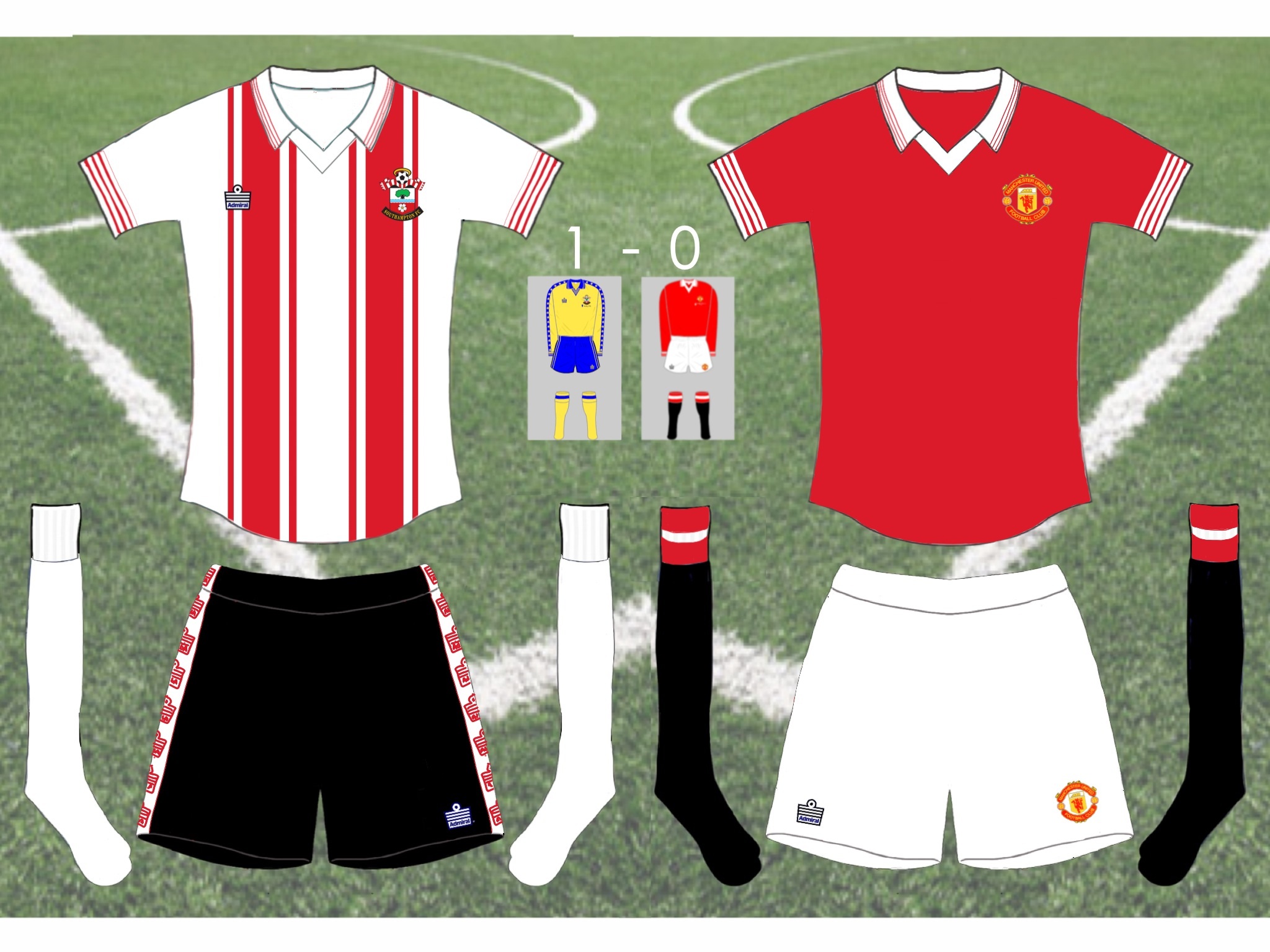 • Generic Description: 1976 cup final and possibly one of the biggest upsets of the decade. Southampton fans had to watch their team in a new specially designed away kit. In what was arguably their finest moment the fans were unable to wear their traditional (at that time) red and white stripes. By simply removing all trace of red on the sleeves and shoulders Admiral could've stuck to tradition without too much of a clash.