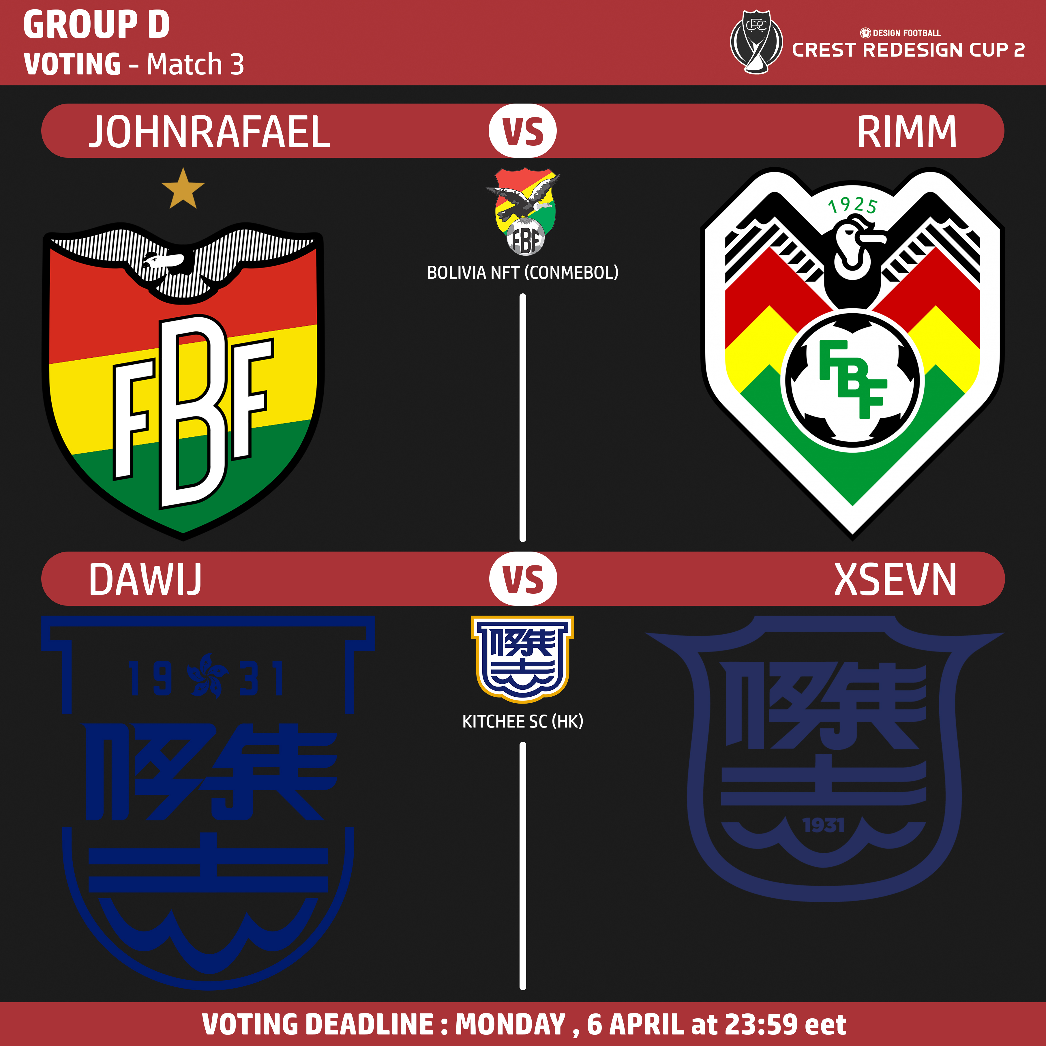 • Generic Description: You can vote, before Monday, 6 April at 23:59 Eastern European Time your favorite redesign of: BOLIVIA NFT between JOHNRAFAEL and RIMM; KITCHEE SC between DAWIJ and XSEVN.