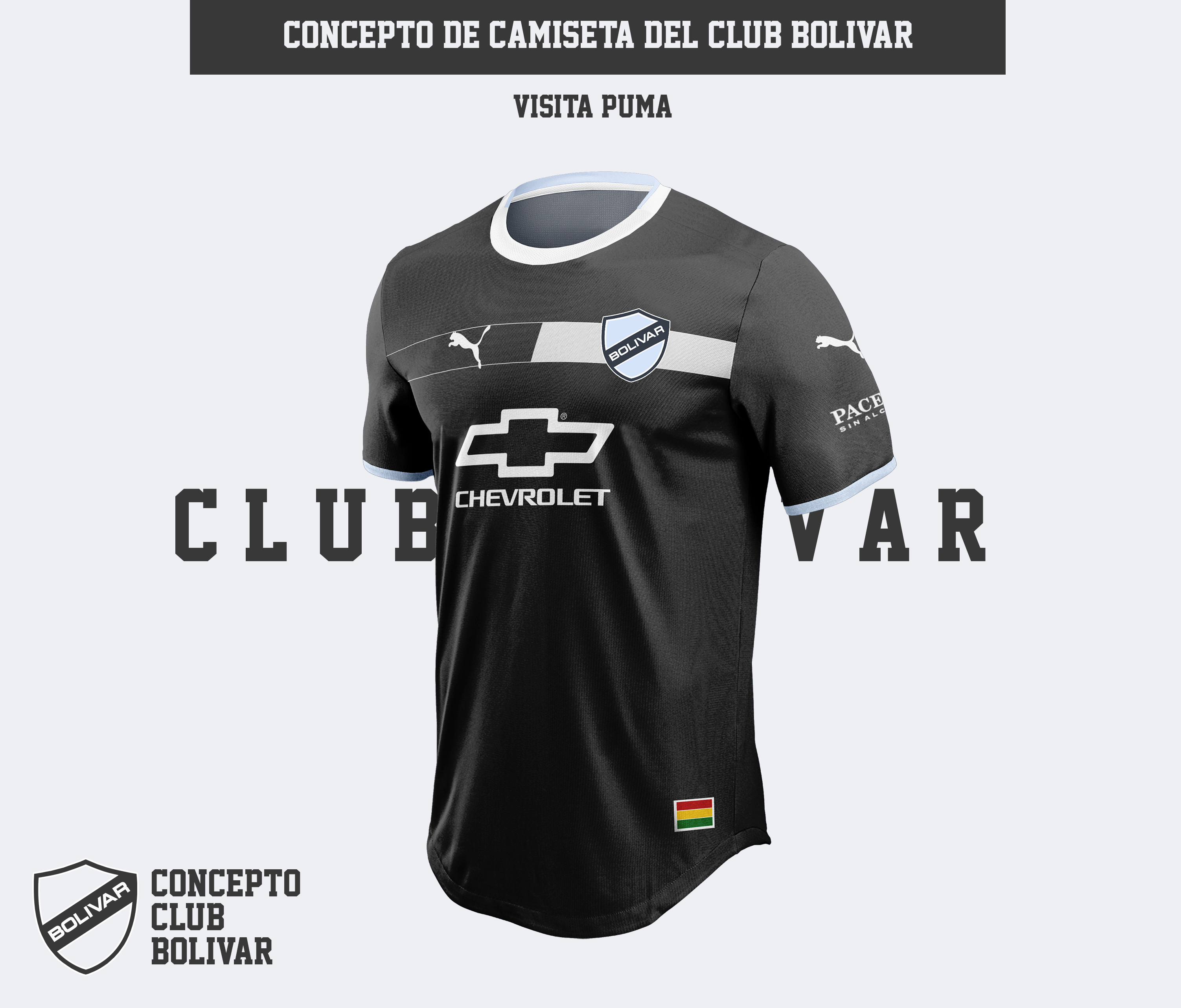 • Generic Description: Es una camiseta en marca puma, ya que esta marca es la que empezará a vestir al Club Bolívar de Bolivia en los siguientes 4 años según el anuncio de su presidente, Marcelo Claure. La camiseta de visita presenta un color plomo casi negro, con un diseño que posee una sencilla franja en la parte de la marca y el escudo y unos toques de celeste cielo en las mangas y el cuello. Como es costumbre de puma, presentar diseños sencillos y complacientes a la vista.