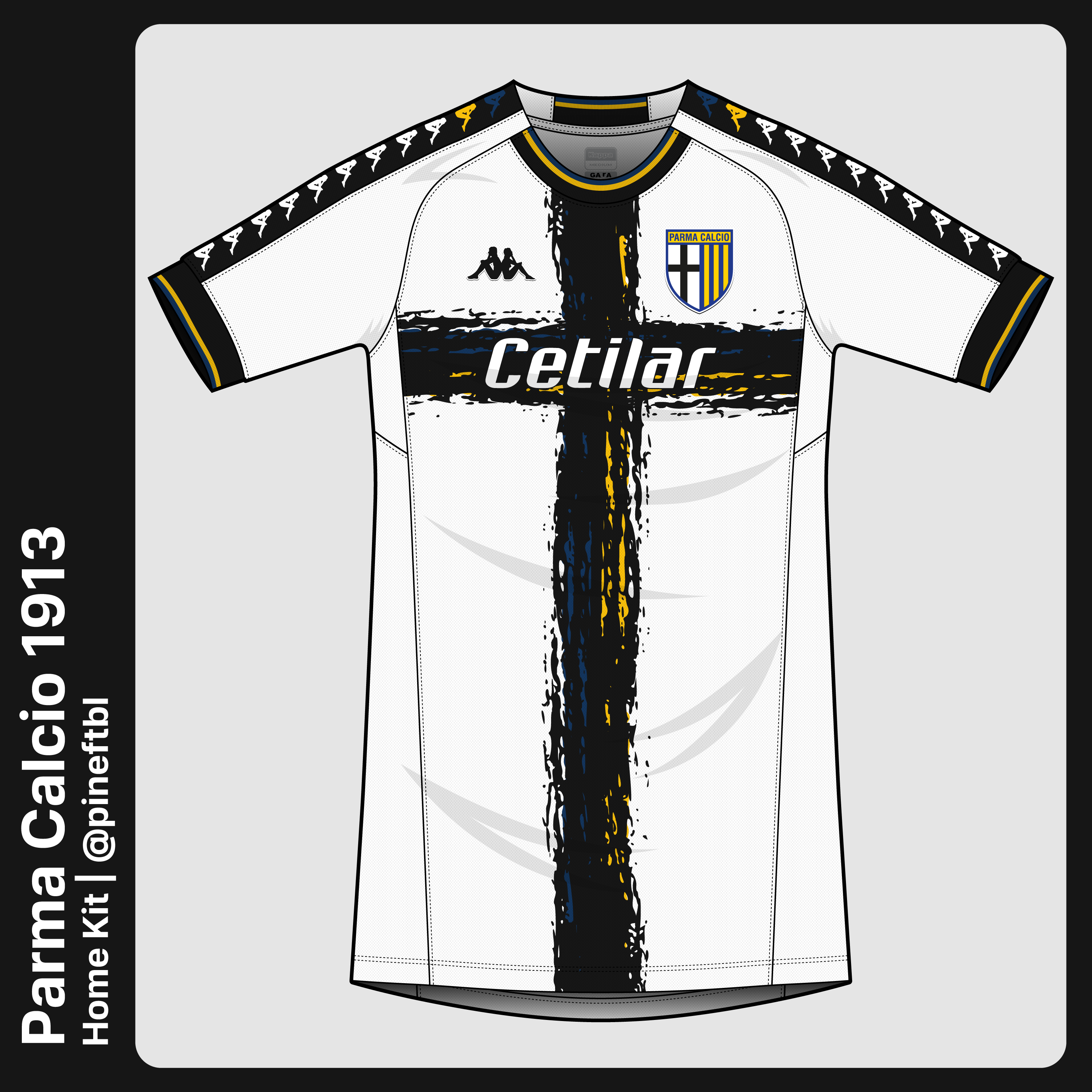 • Generic Description: Home shirt for Parma Calcio. It features the traditional black cross on the front, with blue and yellow accents. I made the template by combining aspects of new and vintage Kappa kits. The kit is completed with black shorts and white socks.
