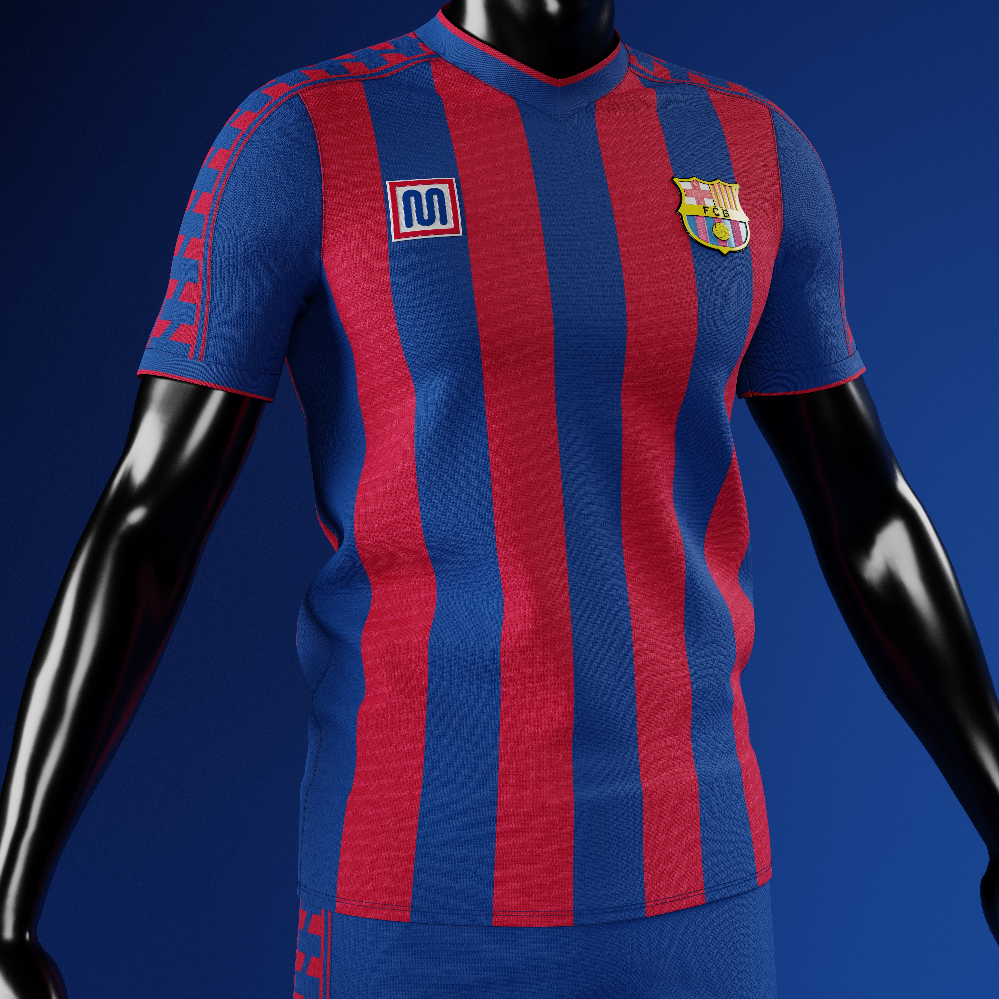 • Generic Description: Home shirt concept for FC Barcelona. The shirt is in their traditional blaugrana colour and features the 'Meyba design' on the shoulders and sleeves. On the maroon stripes, there's a subtle pattern that consists of the 'Cant del Barça', the club's anthem.