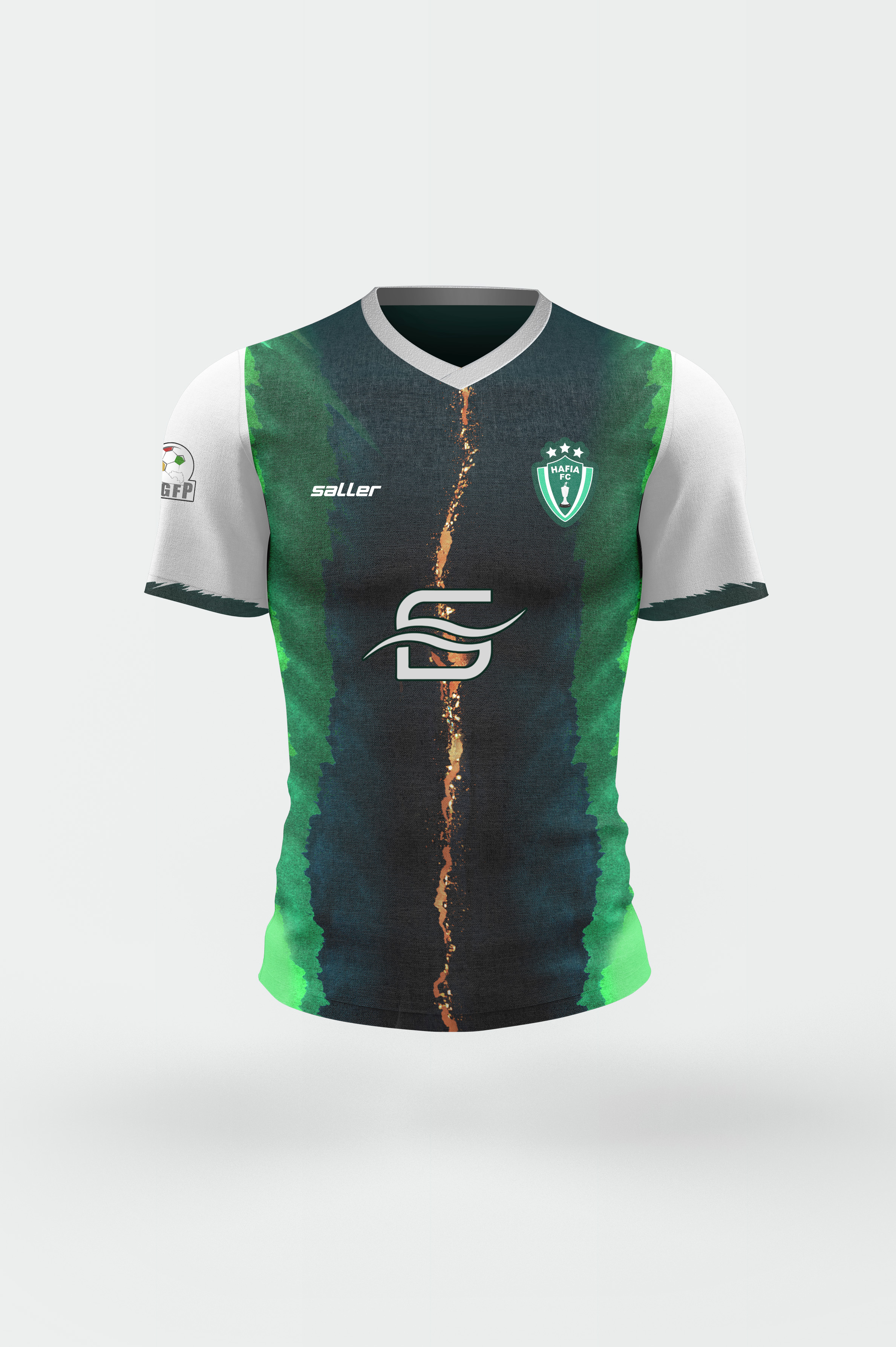 • Generic Description: The design is dynamic concept with watercolour execution in the main body and arm sleeves. The shade of green is an extremely dark which blends into the rich green which are the existing team colours. The highlight of this design is a central golden marble effect which not only depicts the champions of Guinea but it also celebrates the city of conakry with its beautiful shore lines.