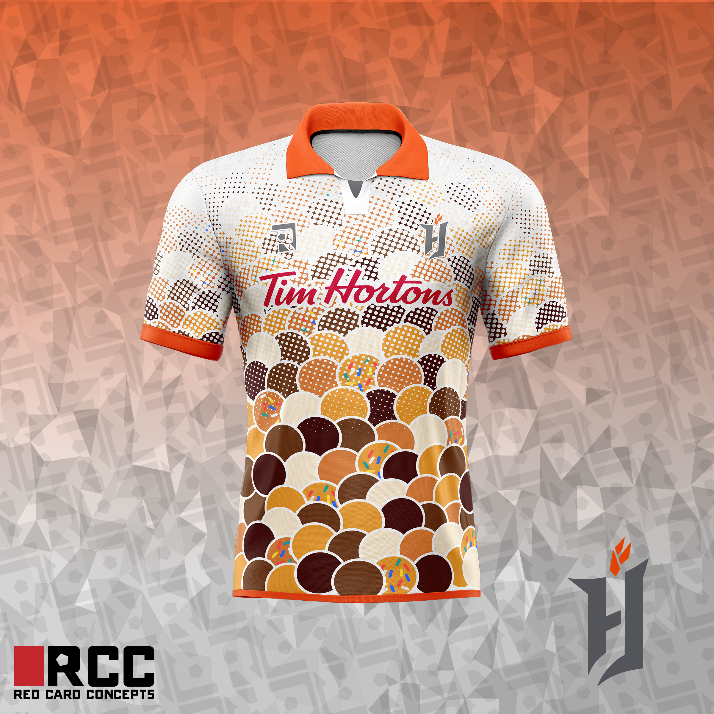• Generic Description: Forge FC plays in Hamilton, Ontario- home of Canada's largest coffee chain, Tim Hortons. Their jersey sponsor is Tim Hortons. They also play at Tim Hortons Field. What if they did a full theme kit? It would probably be a one-off event for one of the Tim Hortons charities. Camp Day, Smile Day, etc. You know, the kind where they auction off the practice-worn jerseys. Anyways. I played around with a "Roll Up The Rim" themed jersey before finally settling on this Timbits idea. Timbits are your standard donut hole. Think Dunkin's Munchkins.