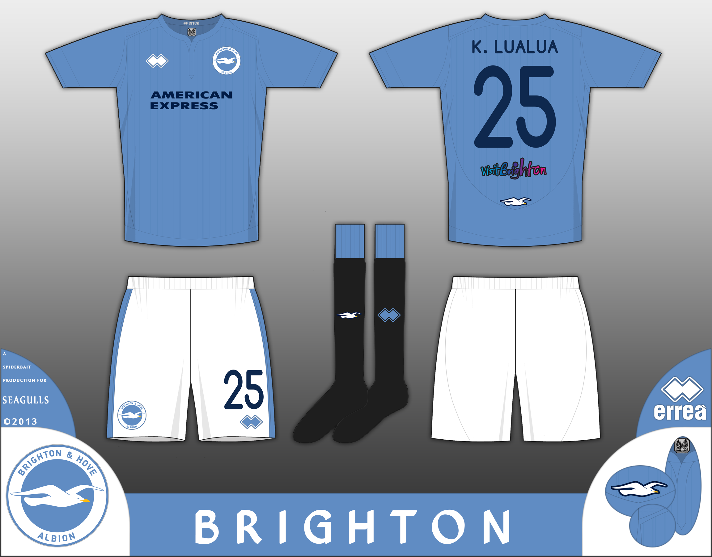 Home kit for the Seagulls, this is in the colours the team wore in the years 1901-03, when they changed their name to Brighton and Hove Albion, and is in the same shade of light blue, with white shorts and black socks.