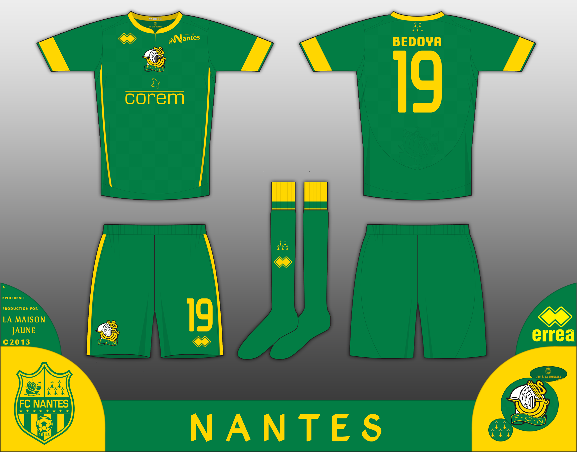 change kit for the Yellow house, 8 times champions of France, this is in all green, with a chessboard pattern on the shirt with yellow trim. Features - 1980s crest used on shirt and socks (it was never used on match shirts) - Ermines, symbol of Britanny from full crest on back of shirt below collar and on socks. - Ship from Current crest embossed on back of shirt. - Full crest on inside of shirt. Please click on zoom button to see in full detail. Comments would be cool