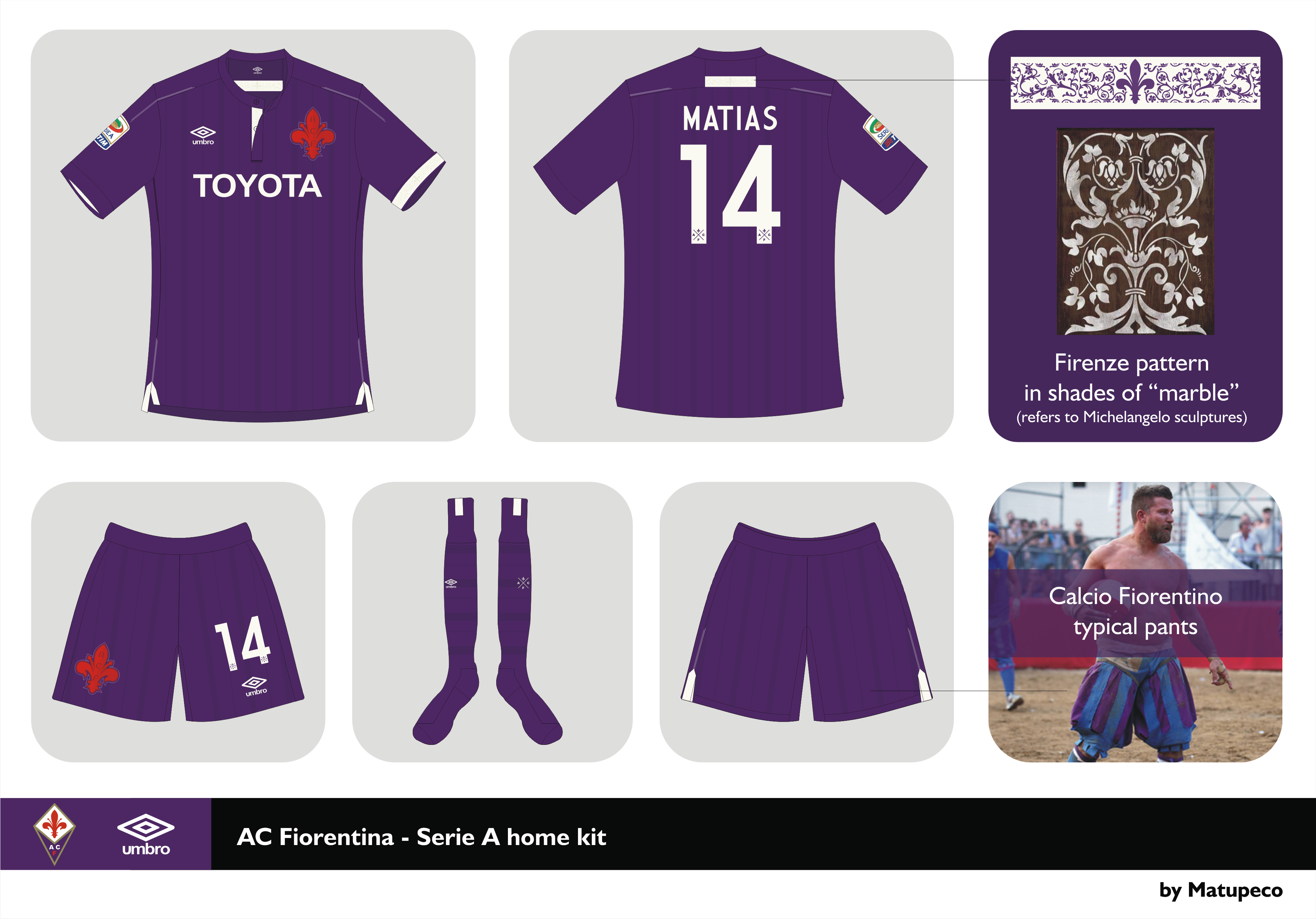 Dark purple, marble details, city typical patterns and sports Firenze inspired kit.