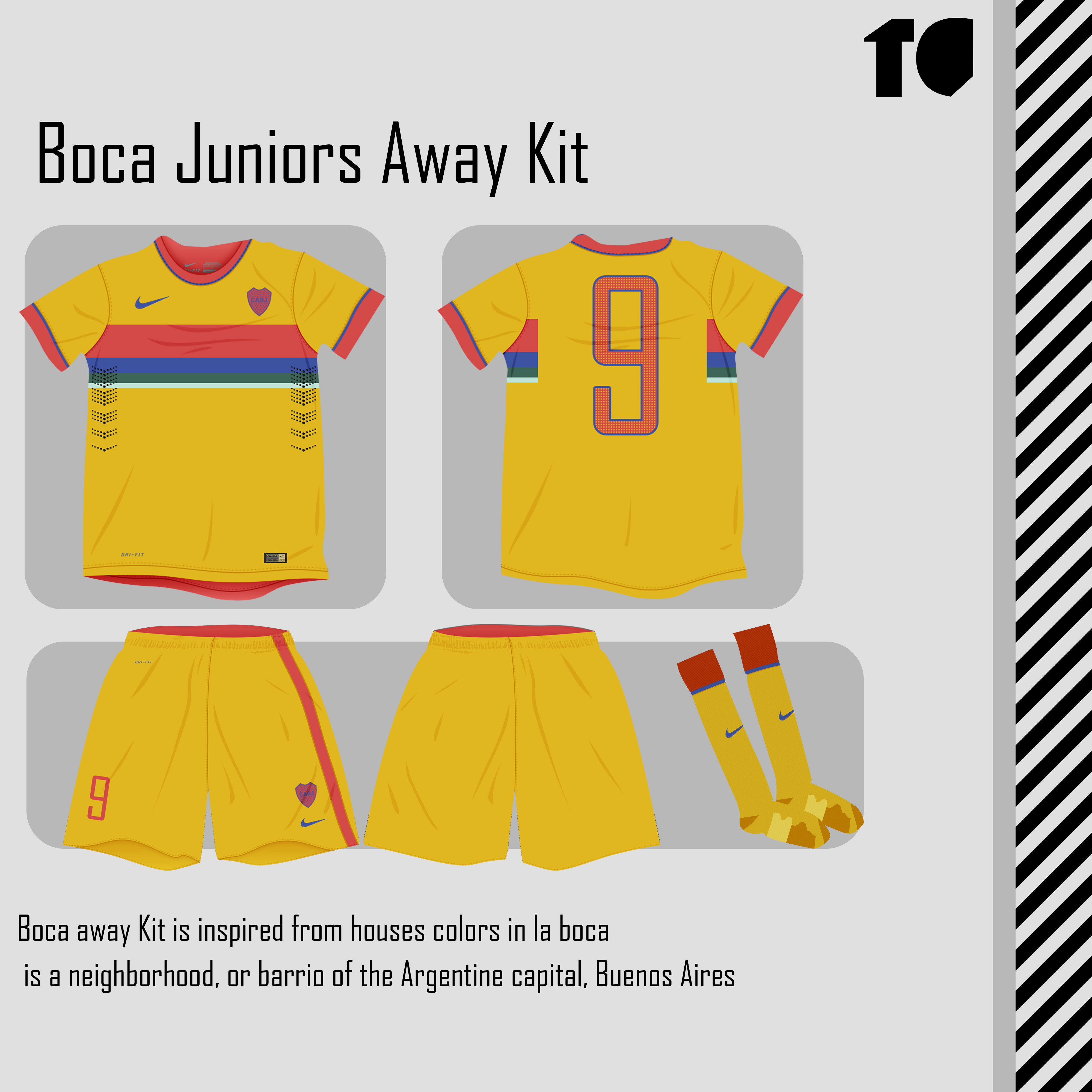 Boca Away Kit is inspired from houses colors in la boca city and i have made the main color of the kit yellow to be the invert of the home kit colors but with houses colors which are very beautiful
