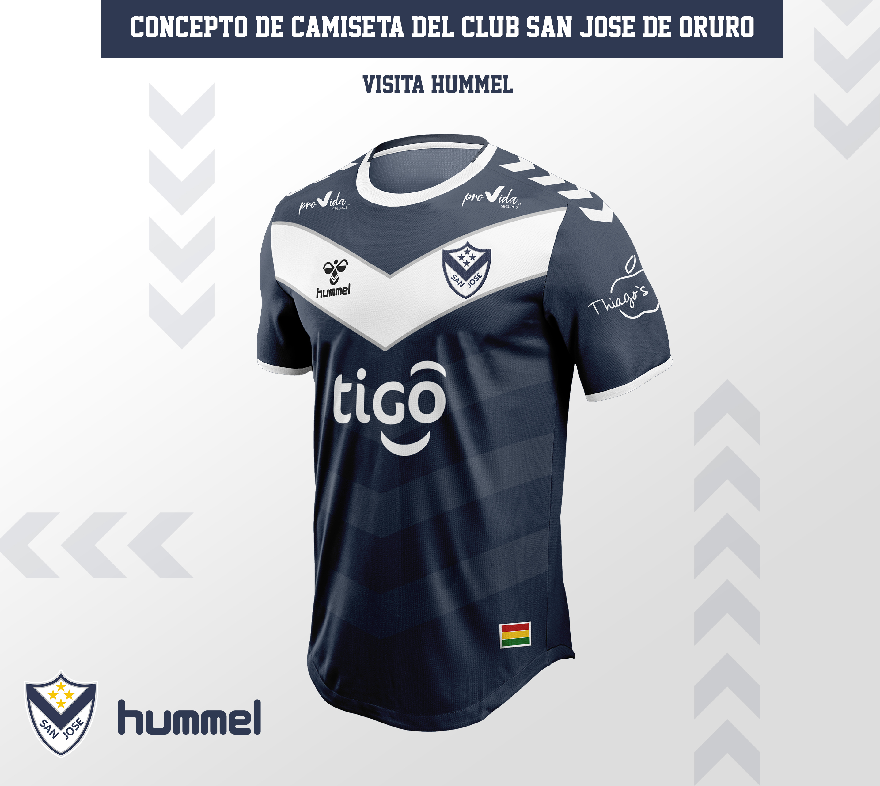 Es un concepto de camiseta, en marca Hummel, ya que existe una similitud entre la marca y la caracteristica v del San Jose de Bolivia, añadiendo a la camiseta algunos patrones al estilo hummel.