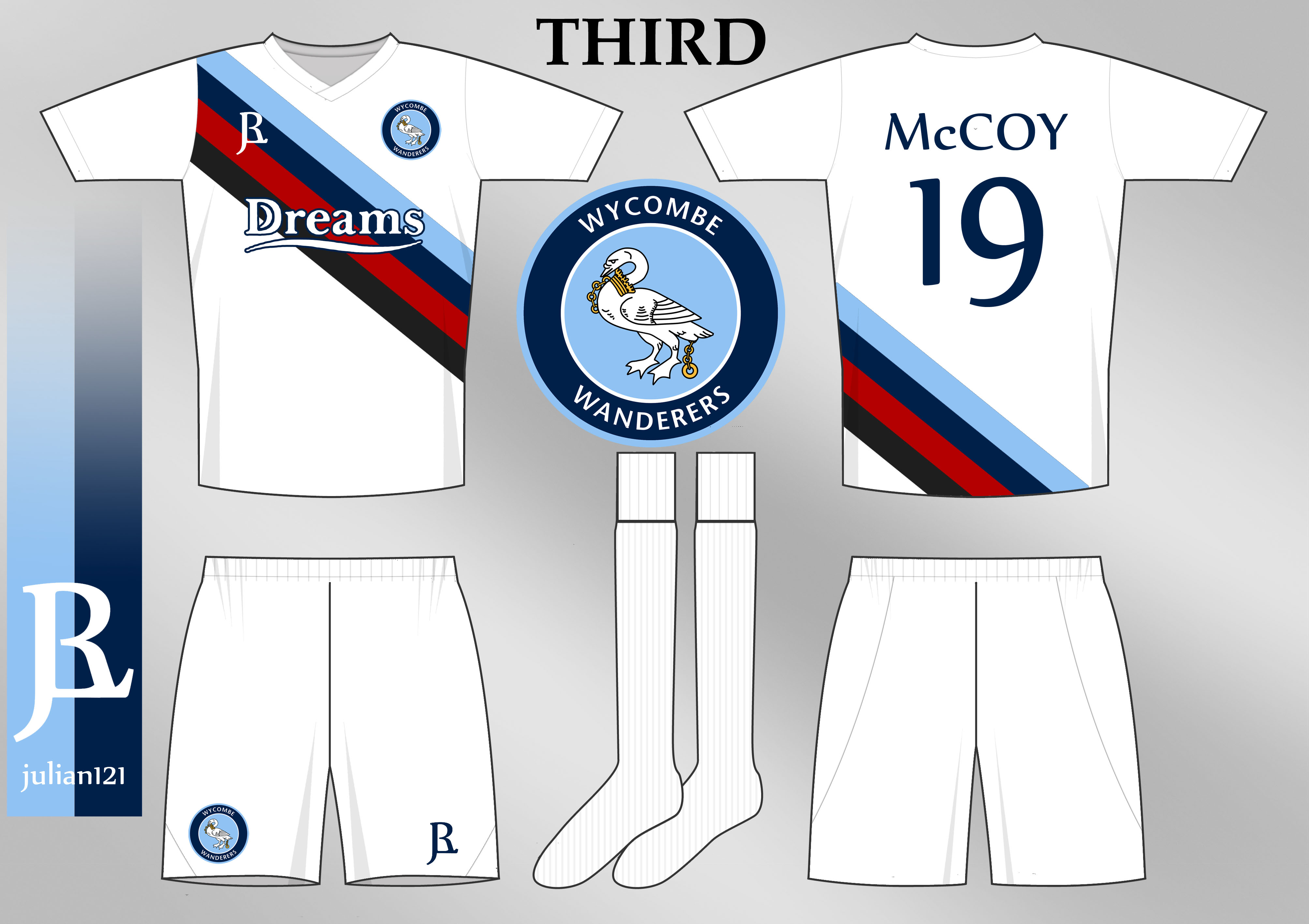 Third. Continuing the colour band theme. Colours are the varsity blues of Wycombe, and the colours of their county, Buckinghamshire. Simplicity is key, so the shorts and socks are plain so as to not detract from the shirt.