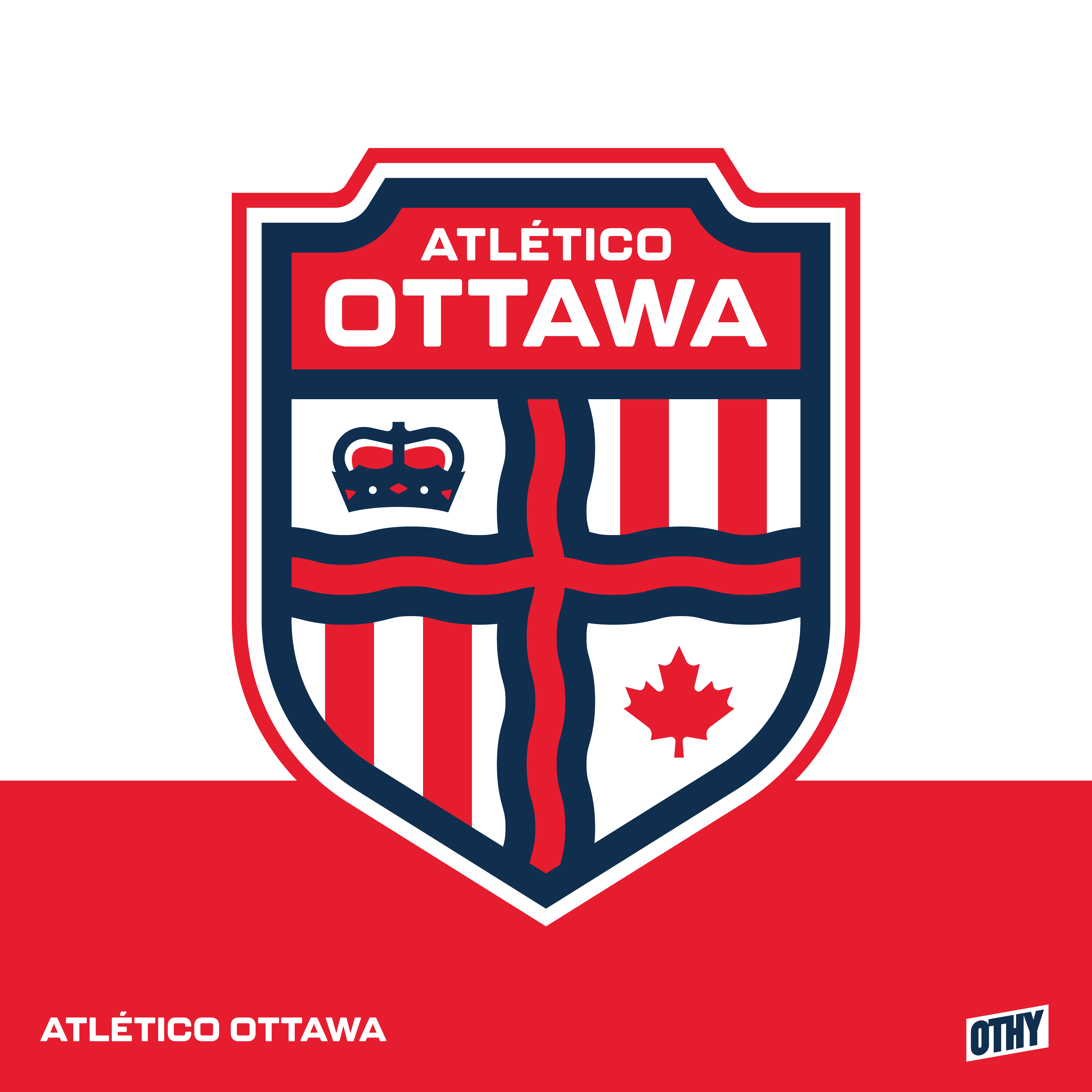 Largely inspired by the Ottawa coat of arms, this Atlético Ottawa crest features a wavy cross and 4 quadrants with a crown and maple leaf (from the CoA) and the club's red and white stripes. The club name is encased in red in the upper part of the shield.