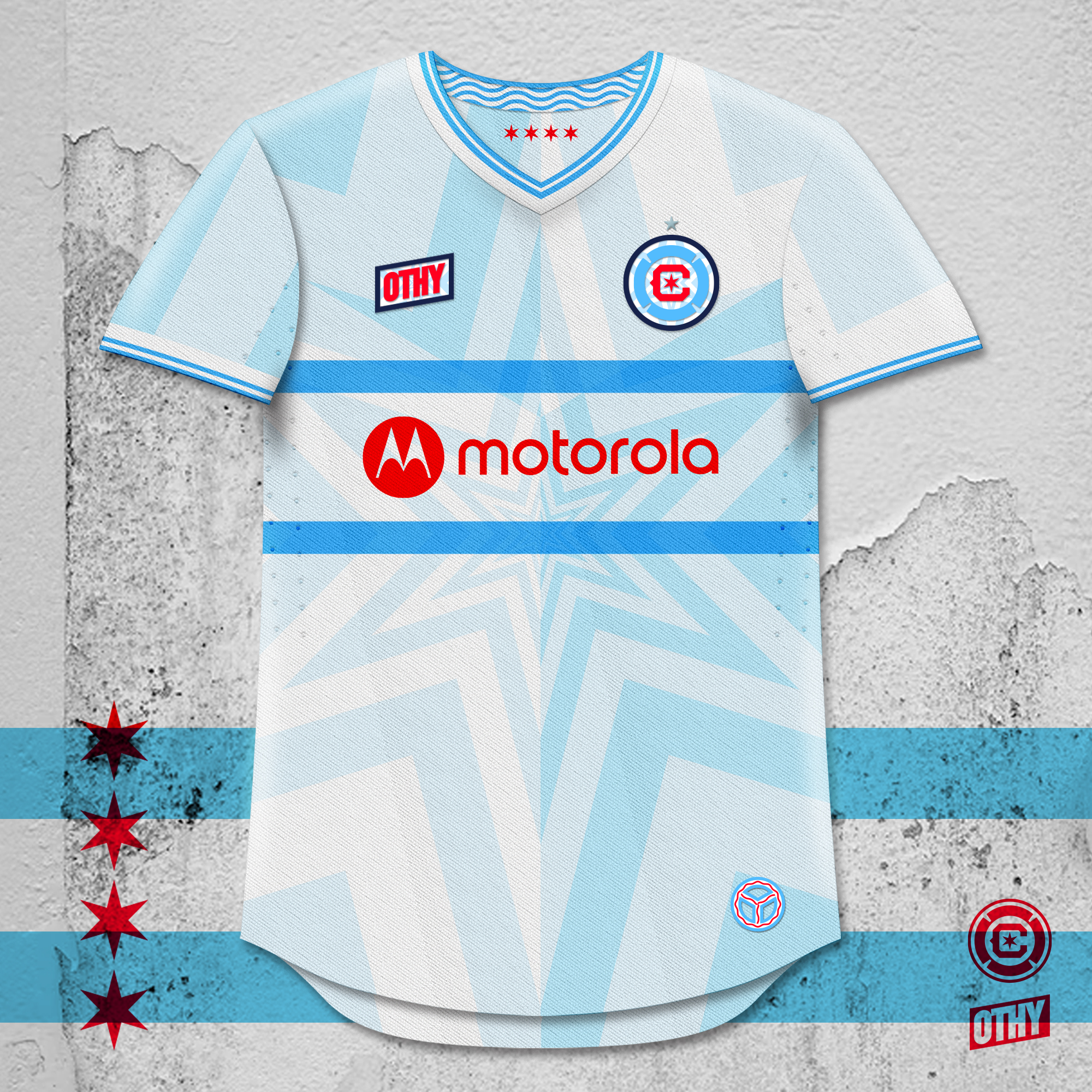 This Chicago Fire away kit is inspired by the 2 most visible symbols of the city of Chicago - the city flag, and the Chicago "Y." The Chicago flag features a white background with 4 red 6-pointed stars between 2 light blue bars. The Y is a reference to the Chicago River and how it splits, forming a Y shape. These references take the form of a star pattern in a pale sky blue with a quartered split where the white is replaced by a pale blue and the blue is slightly darker. The split is formed by a vertical line and a chevron, creating a Y shape. The stars are featured on the inside back of the shirt, with waves (for the flowing river) on the neck tape. A Y symbol with waves - referencing the river - is at the bottom corner of the jersey front. The star pattern is continued in the crest and OTHY logo.