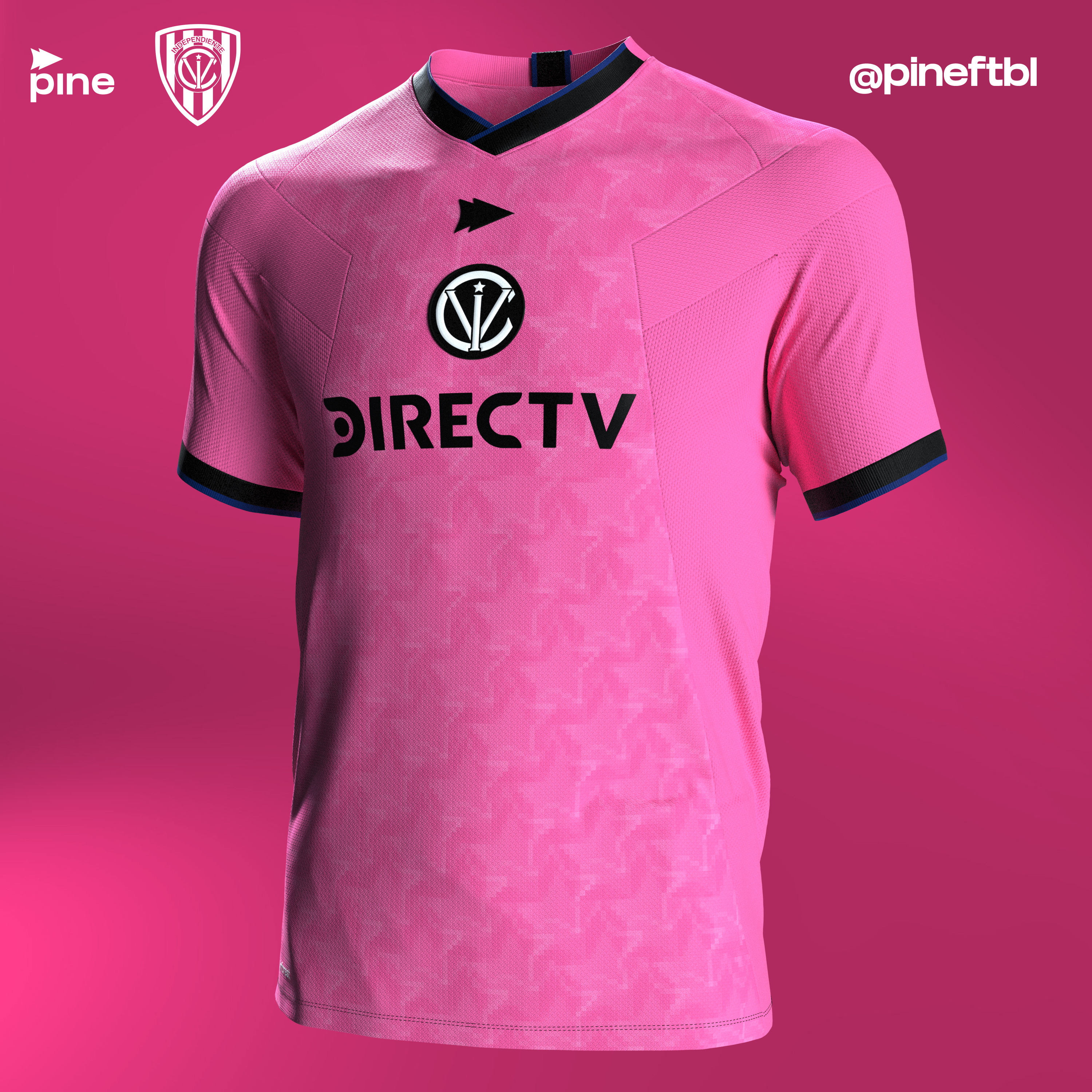 Away jersey for Indepte. del Valle. The shirt is predominantly pink, the traditional away color odf the club, with black and blue details on the collar and cuffs. A star pattern gives it a vibrant look and modern, the star being a symbol of the club than can be found in many of their previous shirts. The kit is completed with white shorts and socks.
