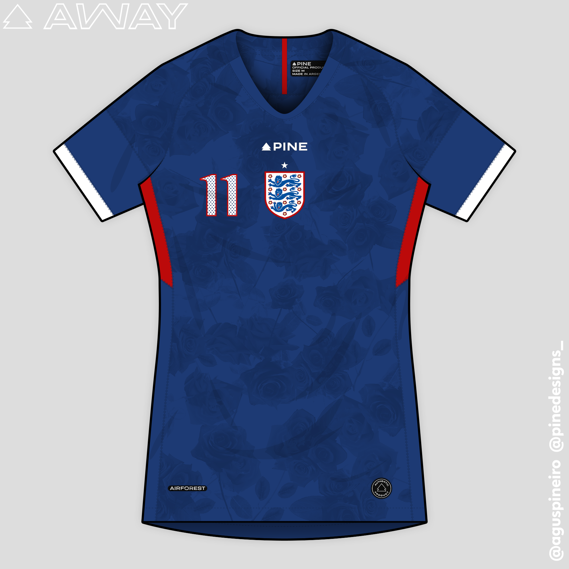 • Generic Description: Away kit design for England's National Team. The pattern is made with roses, which are present in the Association's crest and in the English Coat of Arms. The kit is completed with white shorts and blue socks.