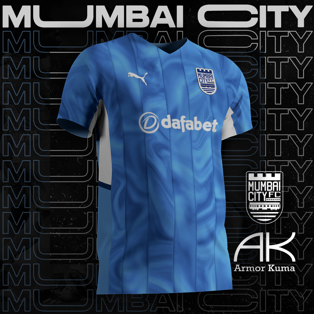• Generic Description: A psychedelic striped Puma home shit on light blue, with blue and white details: this is my proposal for Mumbai City FC.