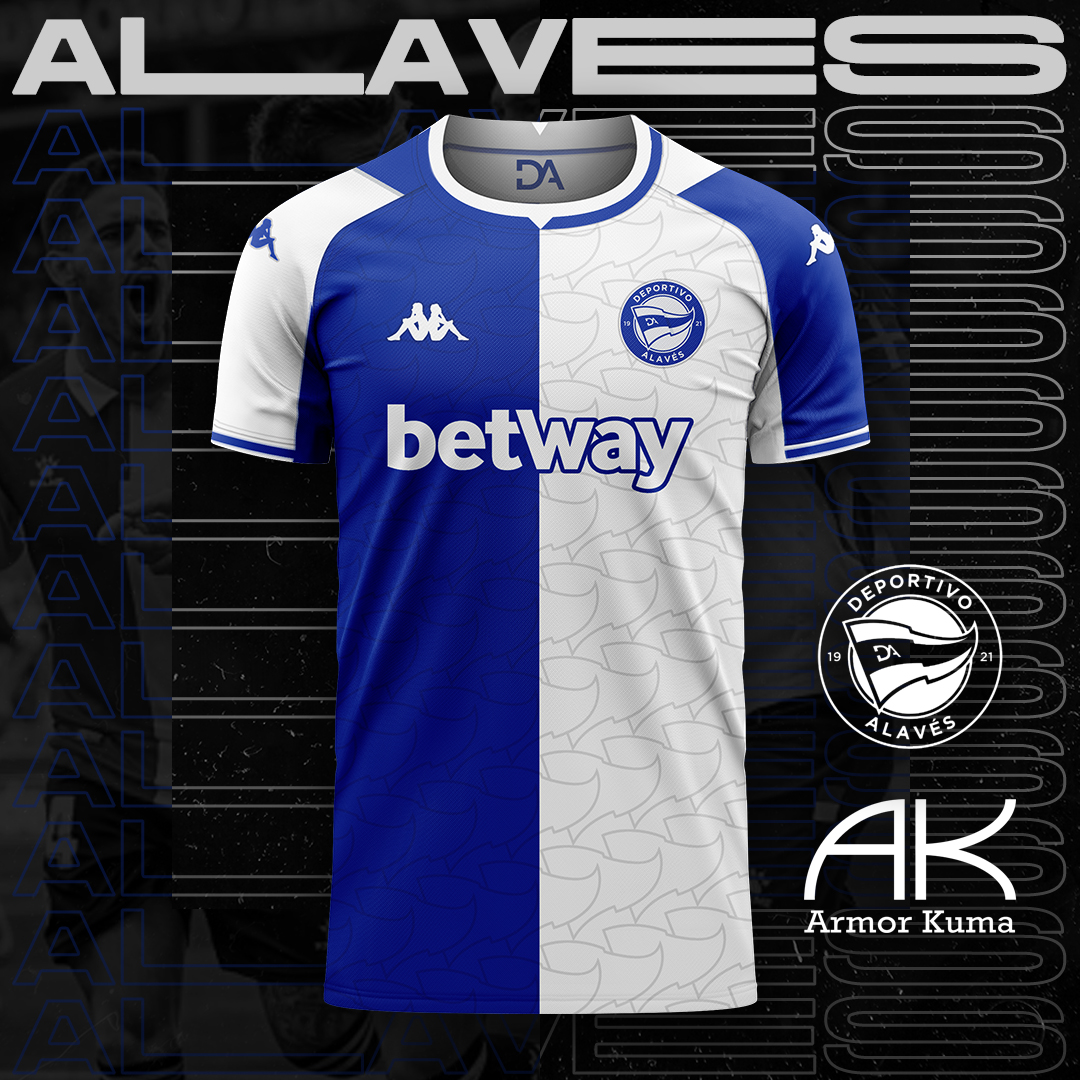 • Generic Description: This Deportivo Alaves half and half shirt combines a classic look with the innovative new logo: the monogram inside the collar and the flags all over the front are the main features of this home kit.