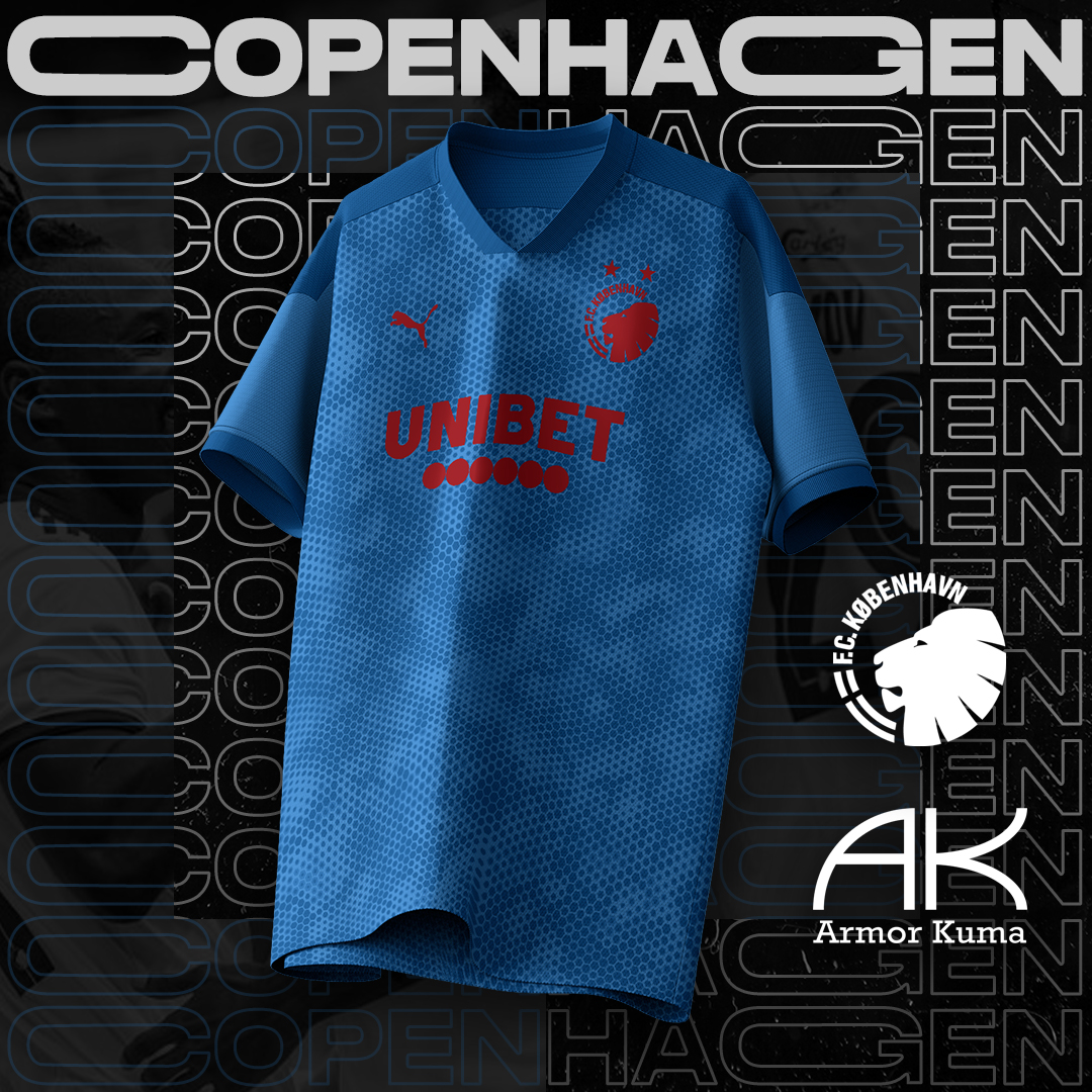 • Generic Description: An away kit for FC Copenhagen focused on mixing different grades of blue together: the result is a simil-camo shirt with applications in red.