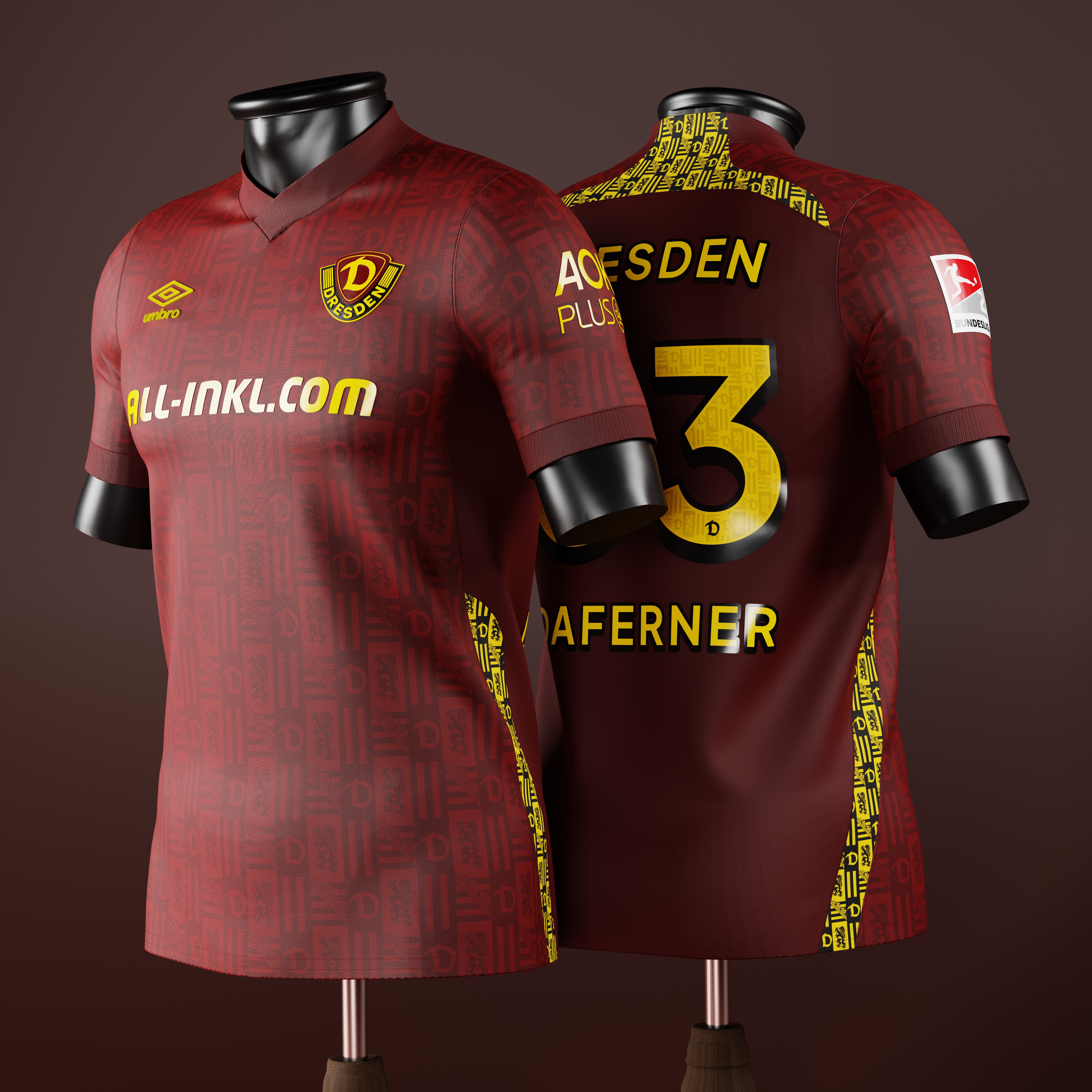 • Generic Description: Away shirt concept for German club Dynamo Dresden. The jersey features a graphic inspired by the club's crest, as well as the coat of arms of both Dresden and Saxony.