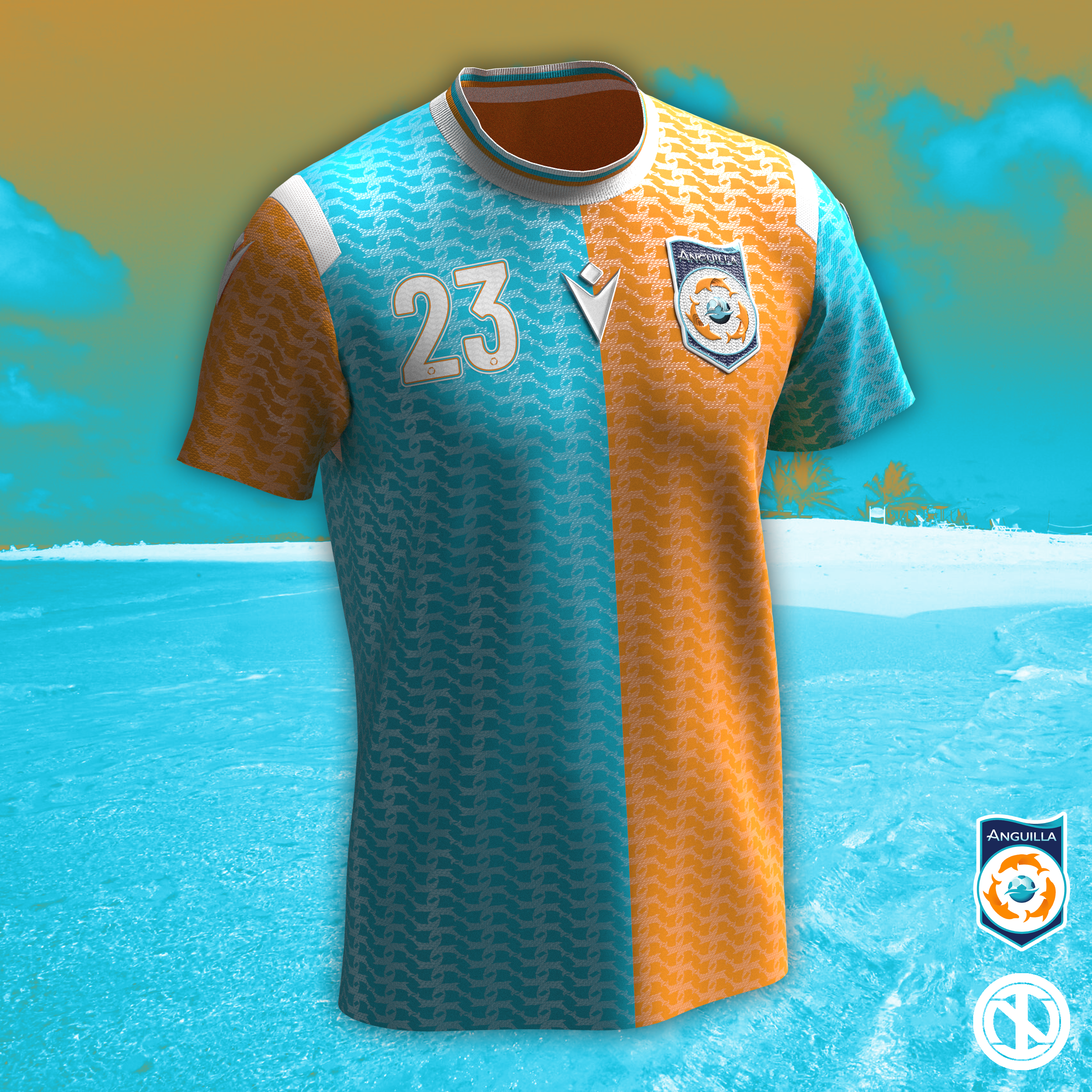 • Generic Description: Home kit concept for the Anguilla National Team. The shirt features the team's unique light blue and orange colourway in a halved design with white details; a jacquard pattern created using the dolphin found in the Federation's crest is present all over the jersey.