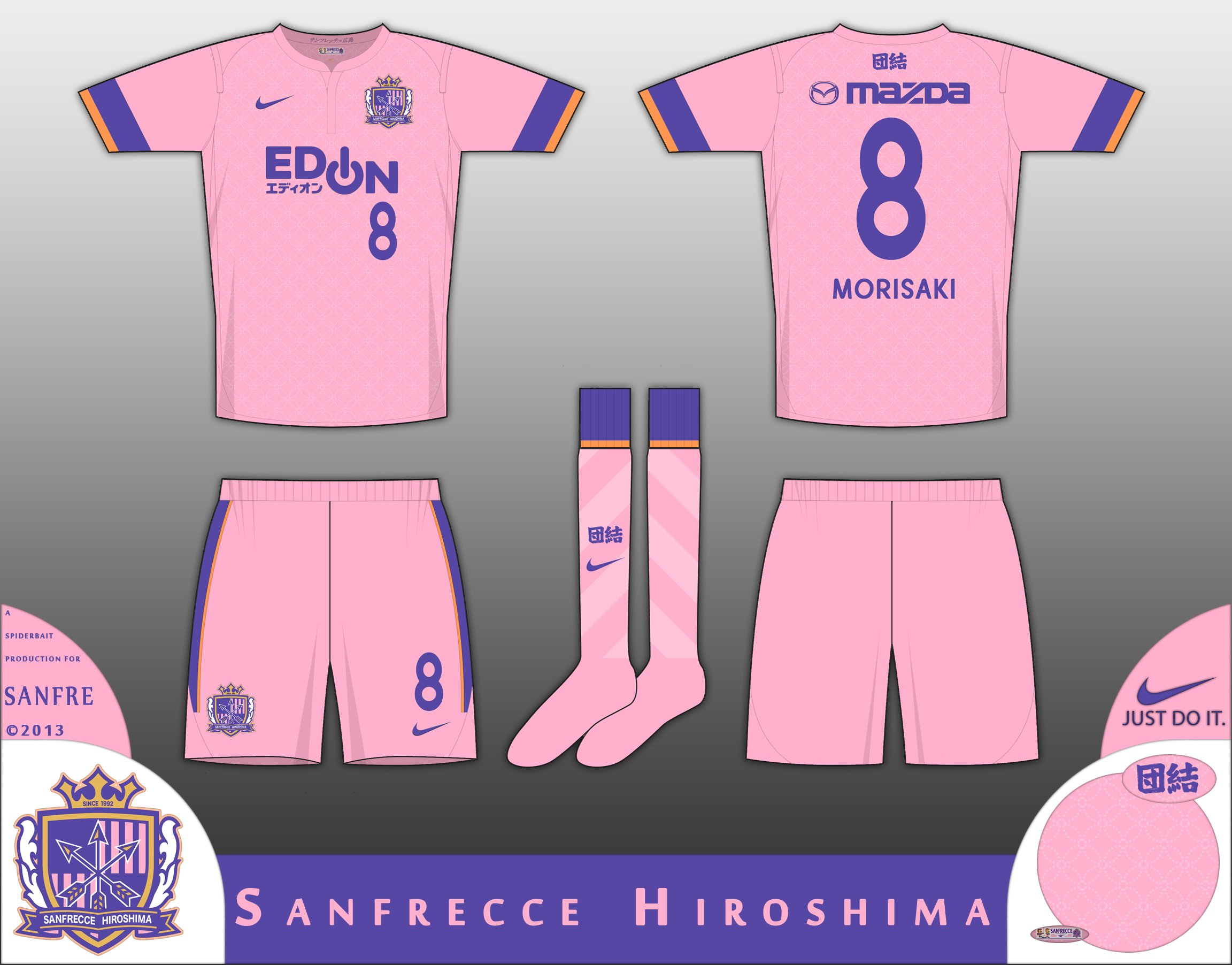 Third kit for Sanfre, in all oleander, with Violet and Satsuma trim. The socks have a spiral design, and on them is the motto for Sanfre, "We Fight Together", which is also on the back of the shirt below the collar.