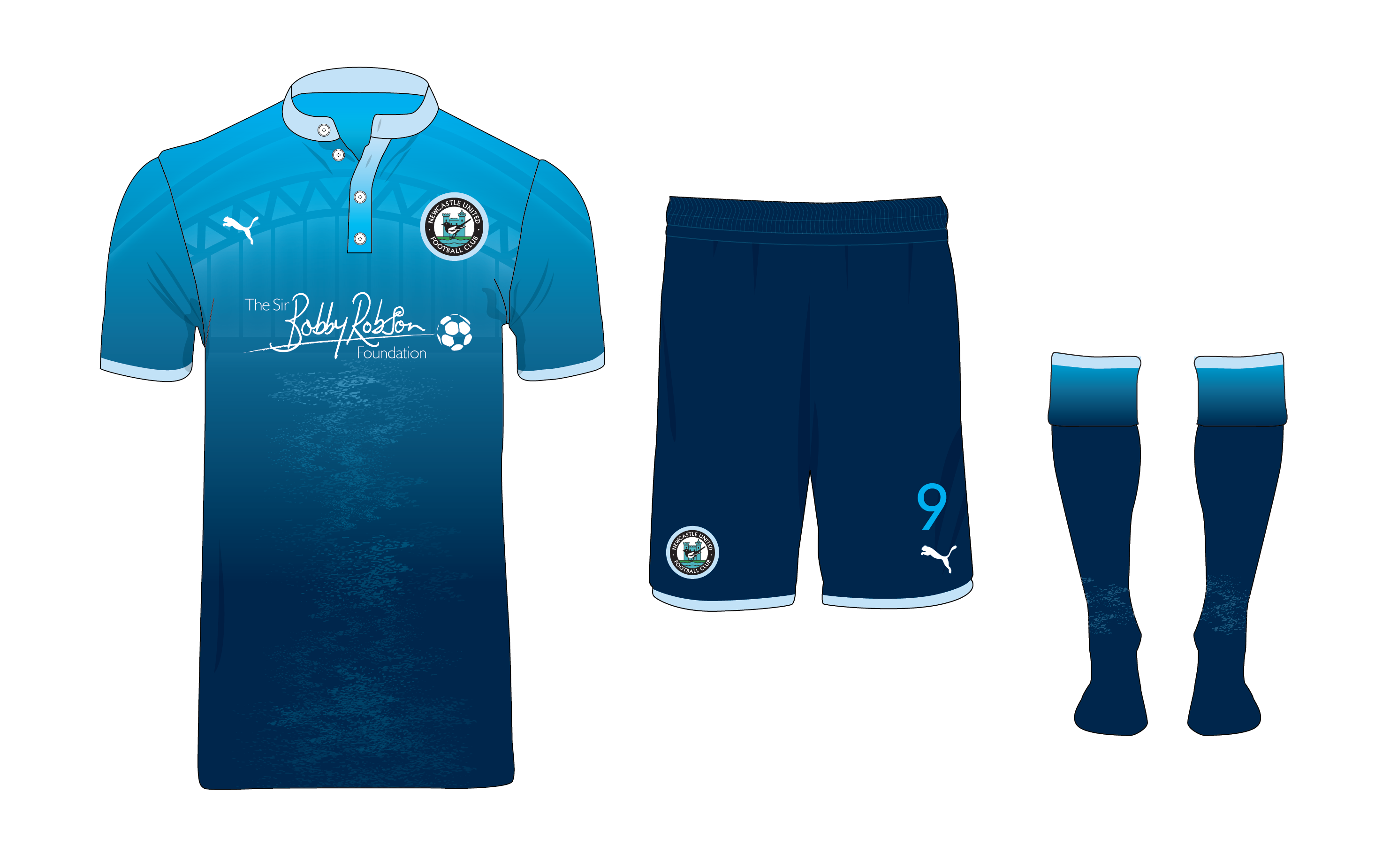 NUFC Away kit inspired by the River Tyne. Retro logo and Sir Bobby Robson Foundation charity sponsor.
