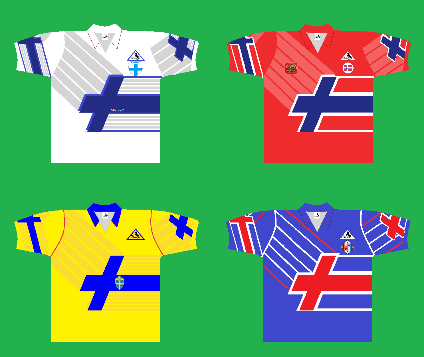 If four of the Nordic countries, in Sweden, Finland, Norway and Iceland, were signed by Blacky in 1990 and took advantage of the Swiss national team template to represent their various Nordic cross flags.