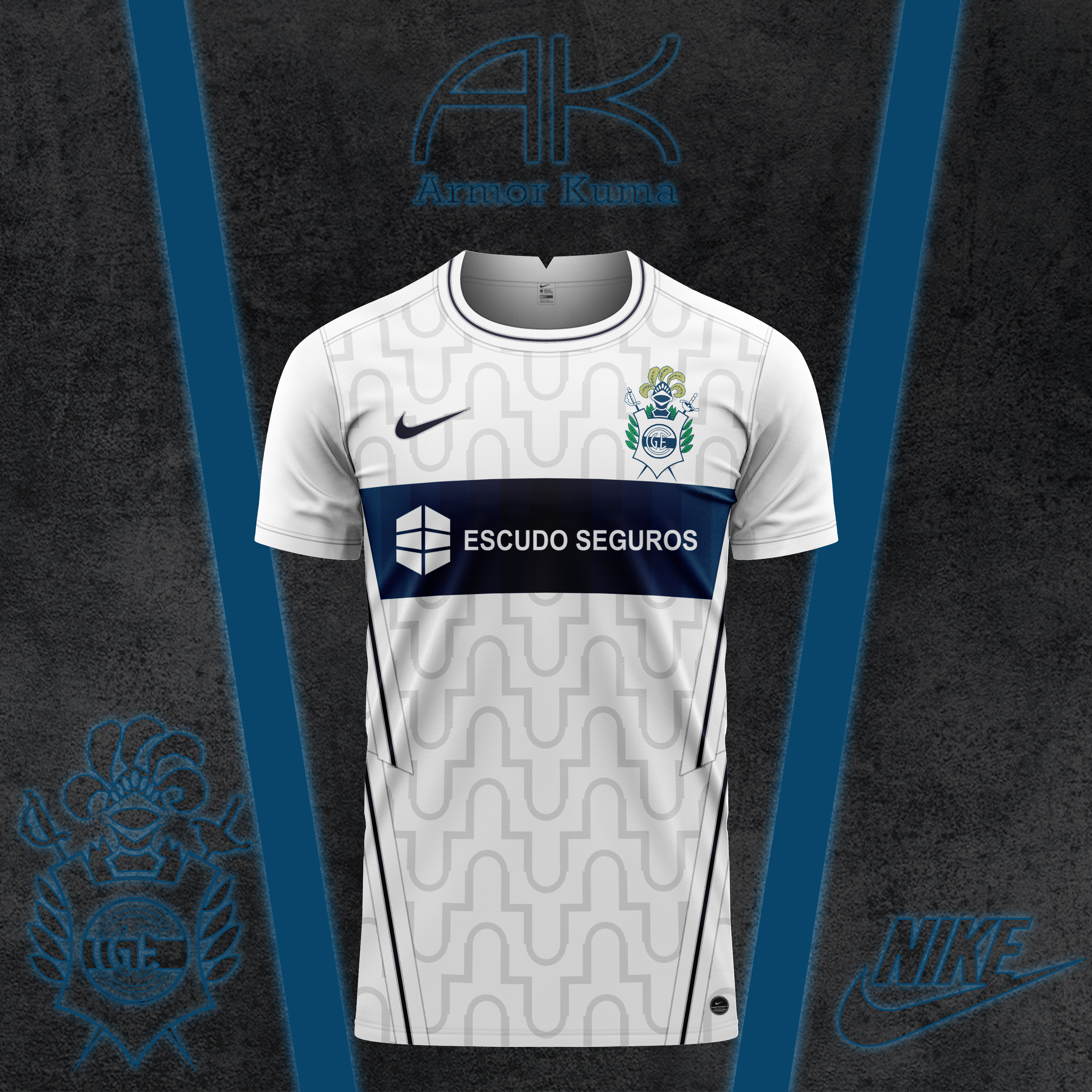 For the team coached by Diego Armando Maradona, I thought of a jersey that was only classic in appearance. The blue band in the center of the home kit of Gimnasia La Plata signed by Nike fades from the center to the sides, with stripes that recall some of the uniforms that the Lobos have had. On the white background, however, there is a geometric pattern that pays homage to the entrance to the Juan Carmelo Zerillo stadium.