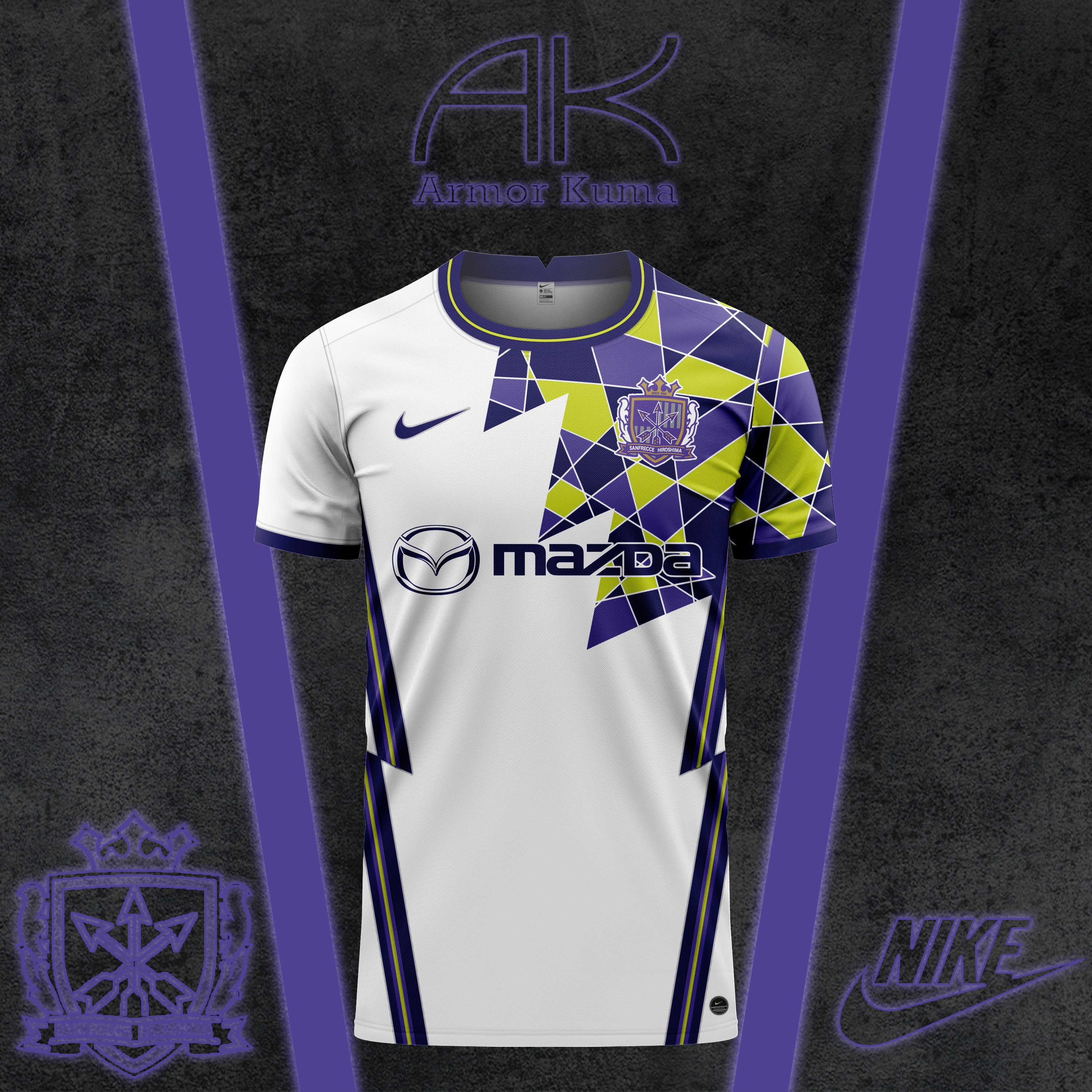This Nike kit for Sanfrecce Hiroshima takes colors from modern uniforms and inspiration from a 1993 Mizuno shirt. The mosaic graphic in two tones of purple and neon yellow occupy the left sleeve and invade the adjacent upper part: the three tips with which it is defined are a reference to the name of the club.