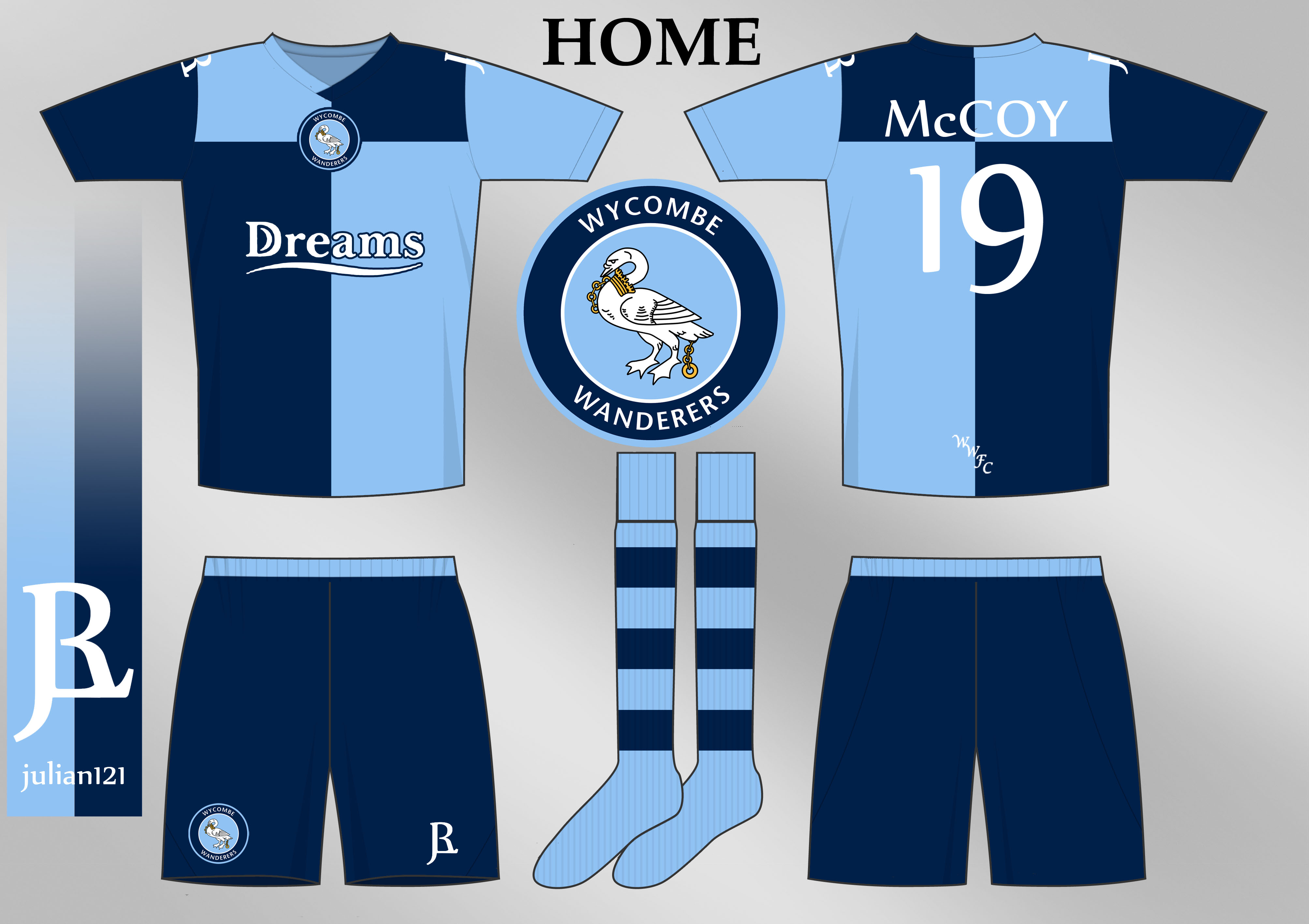 Third. Continuing the colour band theme. Colours are the varsity blues of Wycombe, and the colours of their county, Buckinghamshire. Simplicity is key, so the shorts and socks are plain so as to not detract from the shirt.